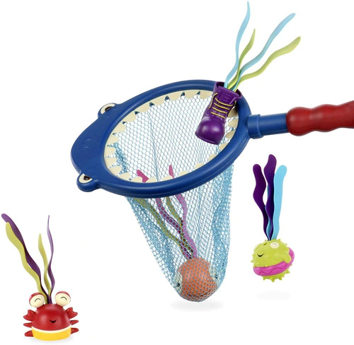 ¡Coge el juego de buceo Scoop-A-Diving de B. toys y disfruta de los días de verano! Lanza los accesorios y sal a cazar: ¡a todos les gusta esconderse bajo las coloridas algas! La red tiene diseños juguetones alrededor del borde, y los ojos siempre están atentos a los pequeños tesoros submarinos. Cada juguete de este juego es fácil de agarrar y los accesorios pesados animan a los más pequeños a trabajar en sus habilidades de natación y buceo. ¡Sin mencionar que este emocionante juego para niños también puede mejorar la coordinación ojo-mano y las habilidades motoras gruesas! Recomendado para niños a partir de 3 años.